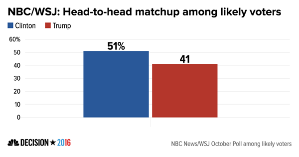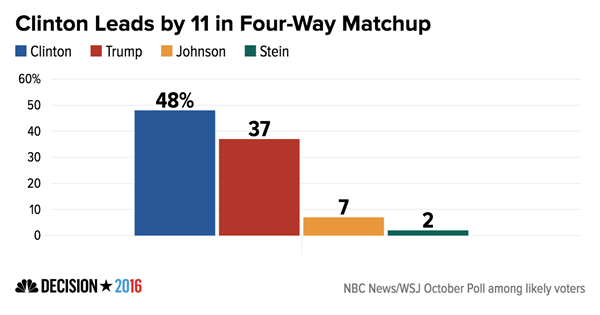 A solo 3 semanas para las elecciones a la presidencia de Estados Unidos, la ventaja de la candidata demócrata Hillary Clinton sobre Donald Trump se mantiene por encima del 10 por ciento, de acuerdo con la última encuesta de NBC y The Wall Street Journal.