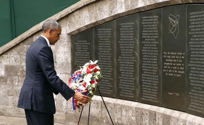 Antes de una reunión formal con Kenyatta el sábado por la tarde, Obama depositó una ofrenda floral en el sitio donde estallaron bombas en la embajada de Estados Unidos en Nairobi en 1998. Obama inclinó la cabeza durante un momento y luego revisó los nombres de las víctimas, grabados en una pared de ladrillo.