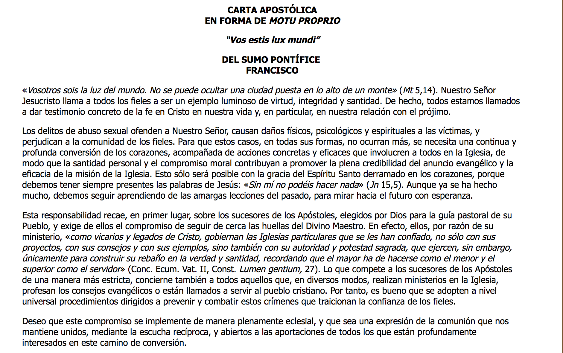 En la introducción de esta carta apostólica titulada “Ustedes son la luz del mundo”, el papa Francisco subrayó que “los crímenes de abuso sexual ofenden a Nuestro Señor, causan daños físicos, psicológicos y espirituales a las víctimas y dañan a la comunidad de los fieles”.