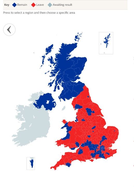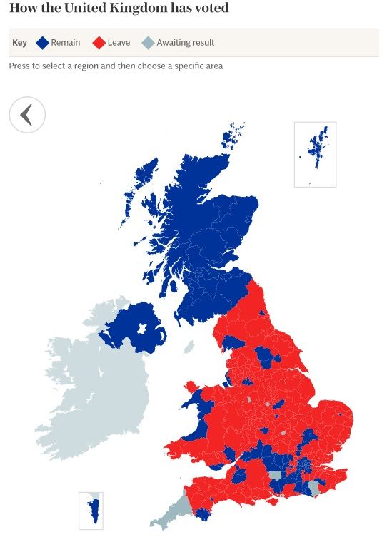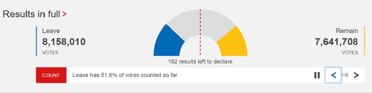 Se acabó el conteo y hay resultados definitivos. Con un 51.9 por ciento de los votos, es decir, con 17 millones 410 mil 742 votos, ganó el Brexit, y con ello se declara oficial el veredicto británico.