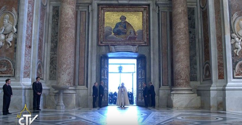 Hacia el final de la misa que celebró ante unas 50 mil personas congregadas en la Plaza de San Pedro, el pontífice se dirigió a la galería de ingreso de la Basílica vaticana donde procedió a abrir el gran portón de madera y metal.