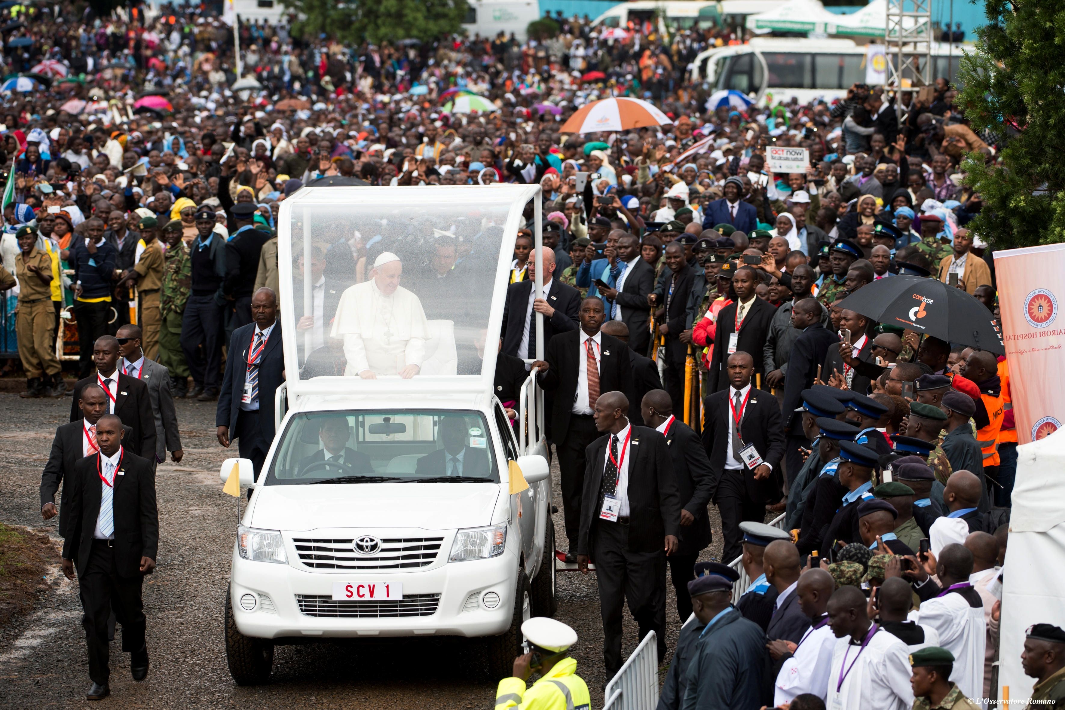 En su primer día completo en Kenia, Francisco recibió una ruidosa bienvenida de la multitud desde su papamóvil