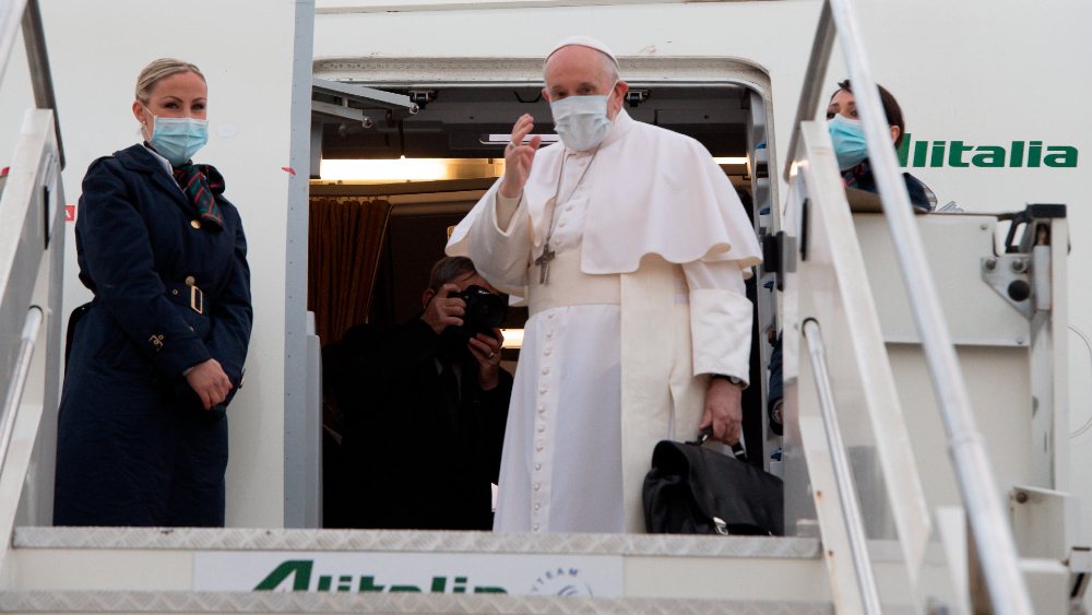 El papa fue recibido al pie de la escalera del avión por el primer ministro, Mustafa al Kazemi, a quien estrechó la mano y dos niños con trajes tradicionales le ofrecieron flores.