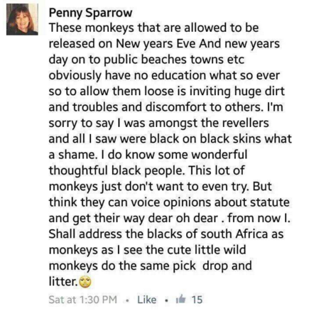 “Estos monos que logran ser liberados en Año Viejo y año nuevo en playas públicas ciudades etc obviamente no tienen educación así que si los dejan libres es provocar mugre y problemas y descontento en otros. Lamento decir que estaba entre los juerguistas y todo lo que vi fue negro y pieles negras qué vergüenza. Conozco algunas personas negras atentas y maravillosas. Este montón de monos ni siquiera lo intentan. Pero creen que pueden opinar sobre su estatus y salirse con la suya oh dios. Desde hoy llamaré a todos los negros de Sudáfrica monos porque veo a los lindos monos salvajes hacer lo mismo agarrar dejar y ensuciar” (sic).