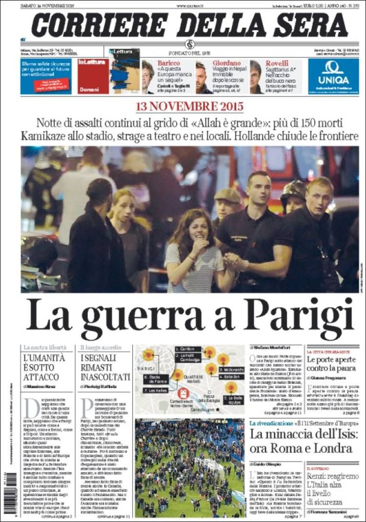 Por su parte, en Italia, el diario “Corriere della Sera” titula su portada como “La guerra en París”, añadiendo además un mapa que muestra las localizaciones de los diferentes ataques en la capital francesa.