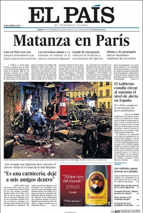 El medio español El País también dedicó su portada a los sucesos de París, titulándola “Matanza en París”, en la cual, señala el “Caos en París tras seis ataques simultáneos que dejan más de cien muertos”.