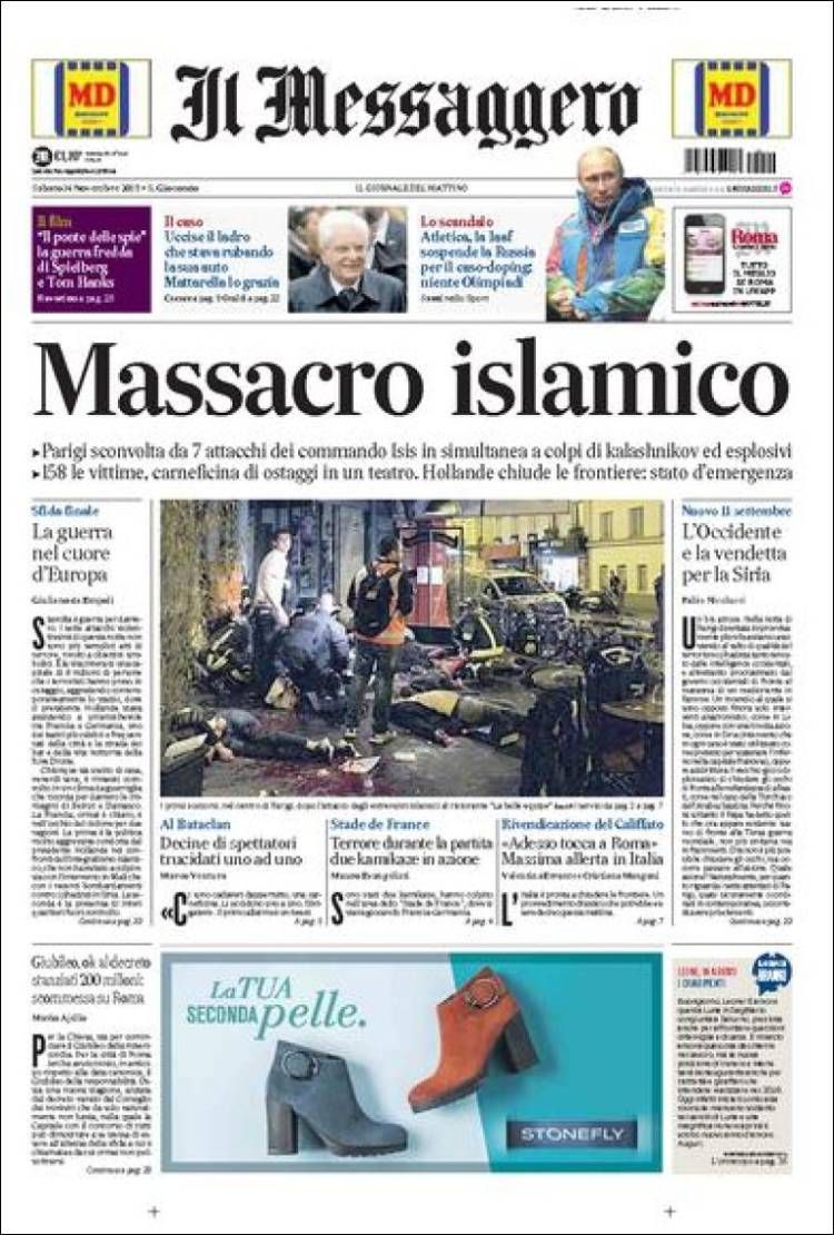 Otro medio italiano, “Il Messaggero”, también lleva la noticia a su portada con el titular ‘Masacre Islámica’ eligiendo como imagen ilustrativa la terraza en la que hay varios cadáveres en la terraza de una cafetería.