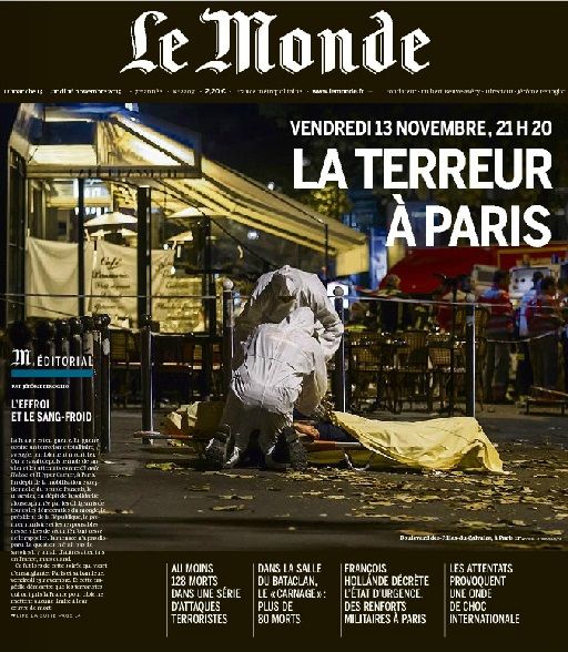 El medio ‘The New York Times’ empleó casi toda su portada con la noticia, titulándola “Los ataques terroristas de París matan a más de 100 personas; Francia declara el estado de emergencia”.