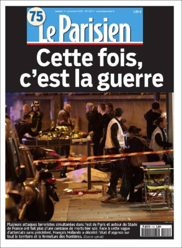 Otro medio local, ‘Le Parisien’, empleó un titular que podría parece más impactante, ya que escribe ‘Esta vez, es la guerra’ poniendo como imagen una de las escenas del atentado en la que se ven cadáveres y también cuerpos de seguridad.