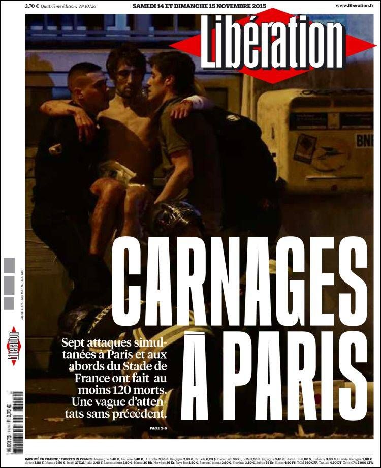 El “Liberation” también ocupa en toda su portada los atentados, empleando el titular ‘Matanza en París’ y de fondo una gran imagen de la terraza del restaurante ‘Le Carrillon’ en la que también se ven cadáveres.