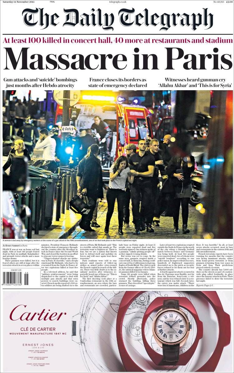 Al igual que ‘The Times’, el titular de ‘The Daily Telegraph’ titula su portada como ‘Masacre en París’, y señala que “Al menos 100 muertos en una sala de conciertos y 40 más en restaurantes y un estadio”.