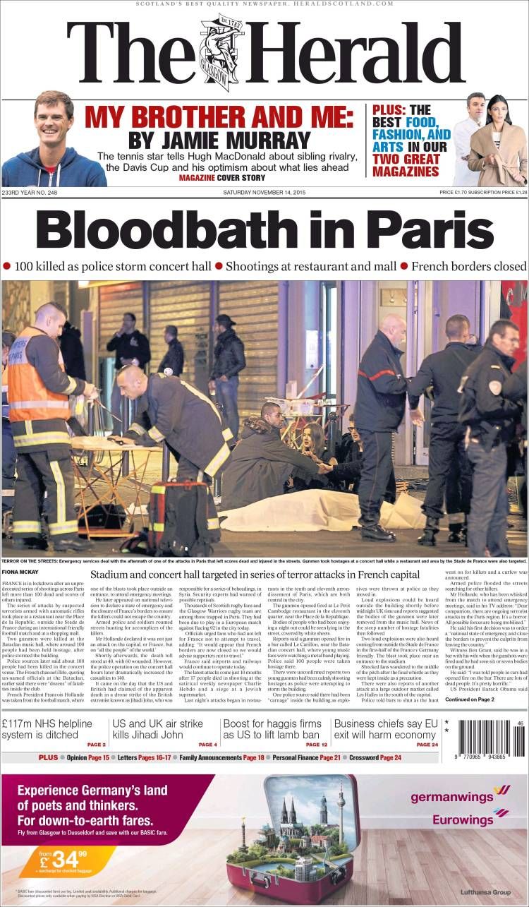 Por su parte, el medio escocés “The Herald”, pone también como titular la noticia de París, titulándola “Baño de sangre en París”, junto a una fotografía en la que se ven víctimas junto a fuerzas policiales y servicios de emergencia.