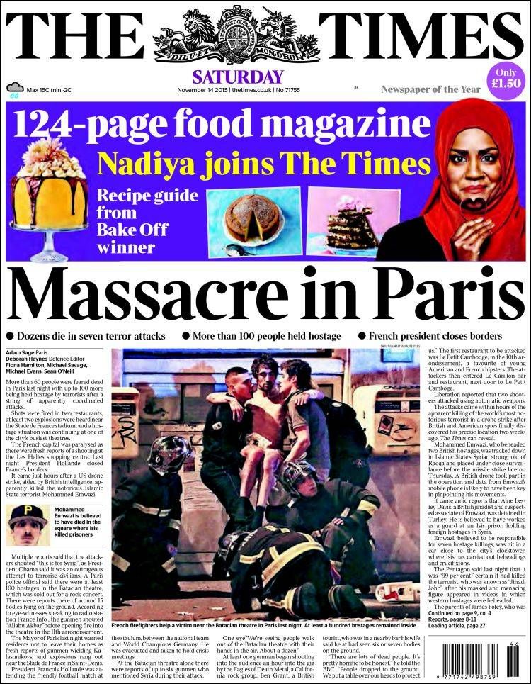 Los diarios británicos también dedican sus portadas a lo ocurrido en París. ‘The Times’, por ejemplo, pone en su titular “Masacre en París” y en sus subtítulos destaca que “Decenas mueren en siete ataques terroristas”, “Más de 100 rehenes”, así como “El presidente francés cierra las fronteras’.