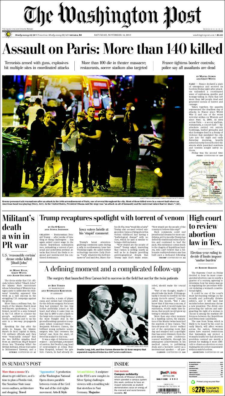 Por su parte, “The Washington Post”, también dedica su portada al tema, titulando su nota “Ataque en París: más de 140 personas asesinadas”, el cual también ilustra con un mapa que muestra los lugares donde se registraron ataques.