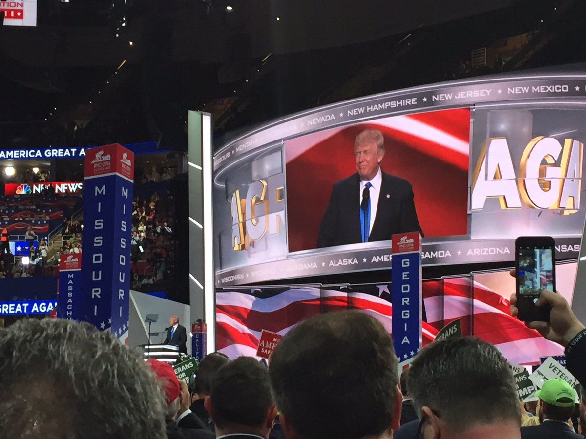 En medio de una ovación, el aspirante presidencial estadounidense Donald Trump apareció esta noche ante miles de seguidores en la Convención de Nacional Republicana para presentar a su esposa Melania Trump, oradora principal de este lunes.