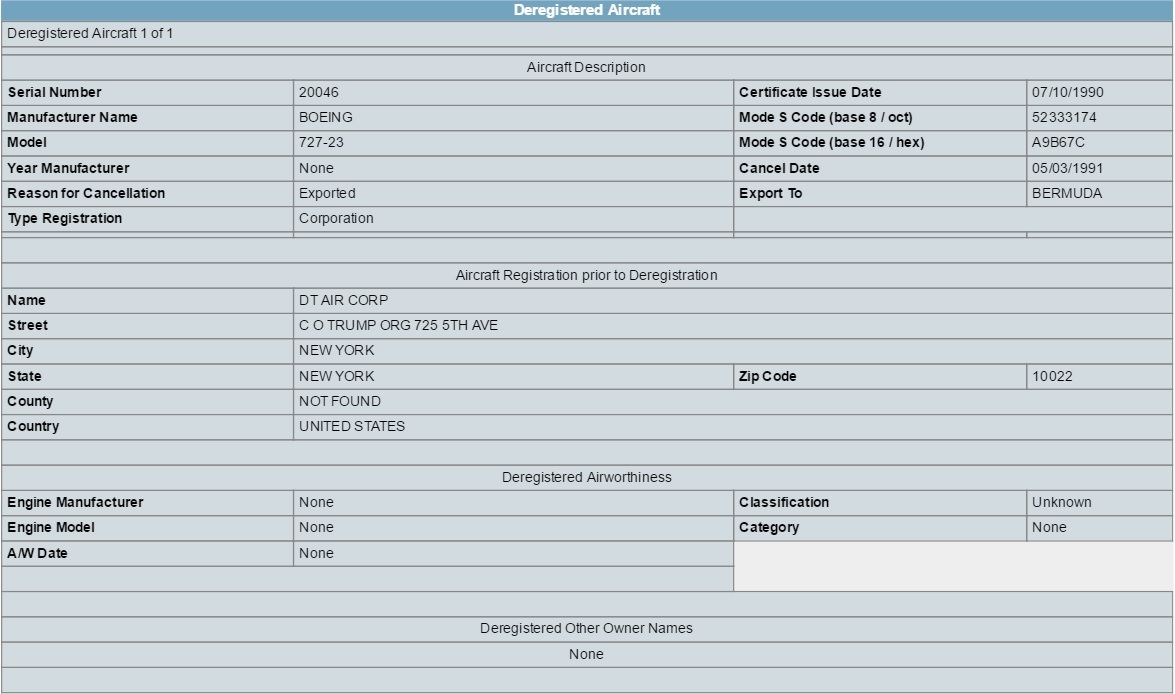 El avión está registrado a nombre de una sociedad de responsabilidad limitada cuyo único miembro es Donald Trump. El número de la matrícula de identificación del avión, N725DT, también incluye las iniciales del magnate.