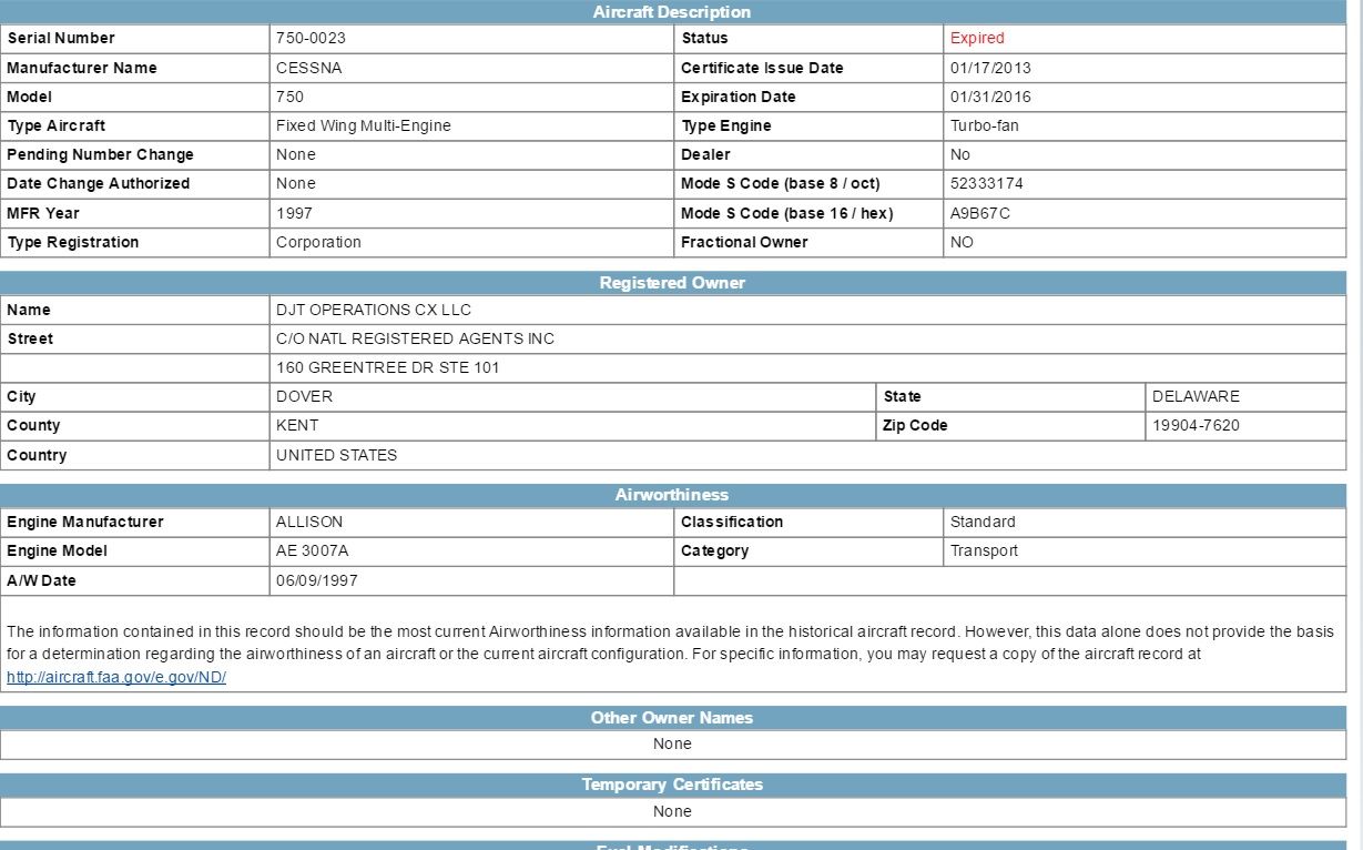 La Administración Federal de Aviación de Estados Unidos (FAA por sus siglas en inglés) indicó en un comunicado que sus inspectores han contactado al piloto del avión 750 Citation X de Trump sobre el registro de la aeronave, que expiró en enero.