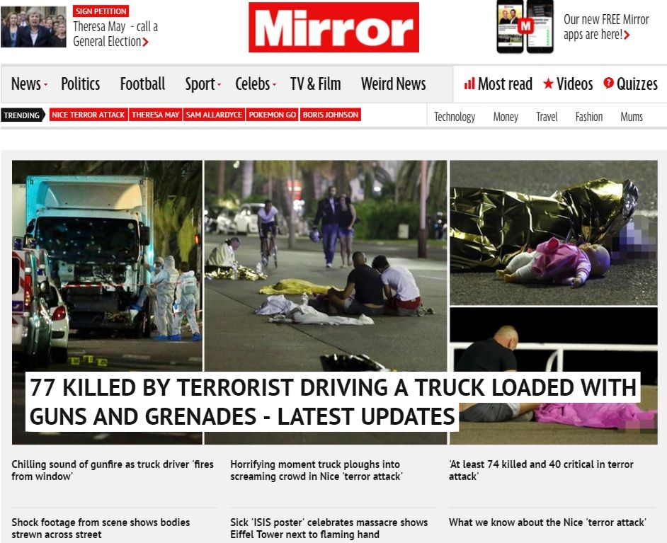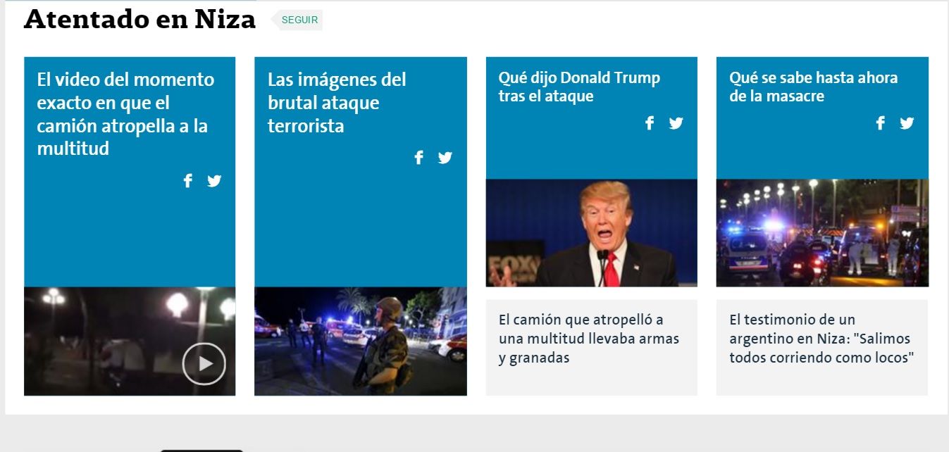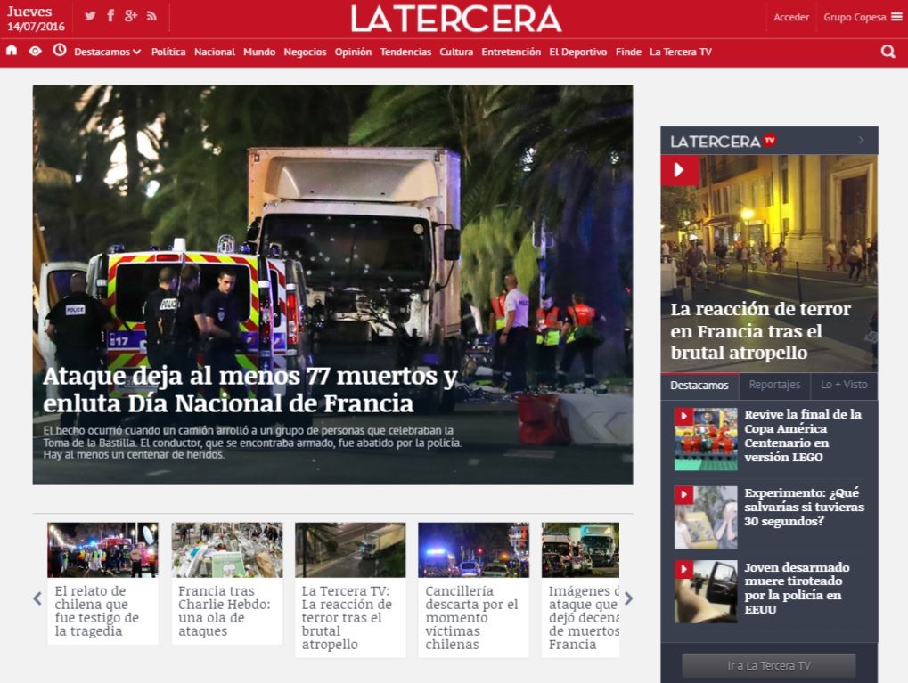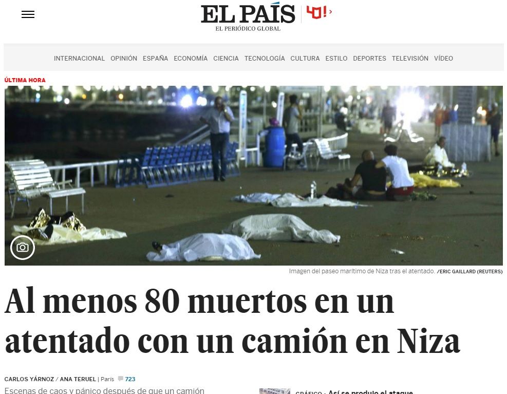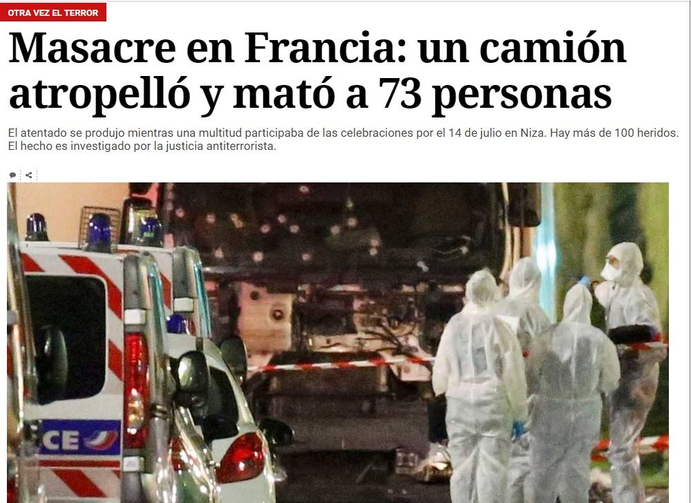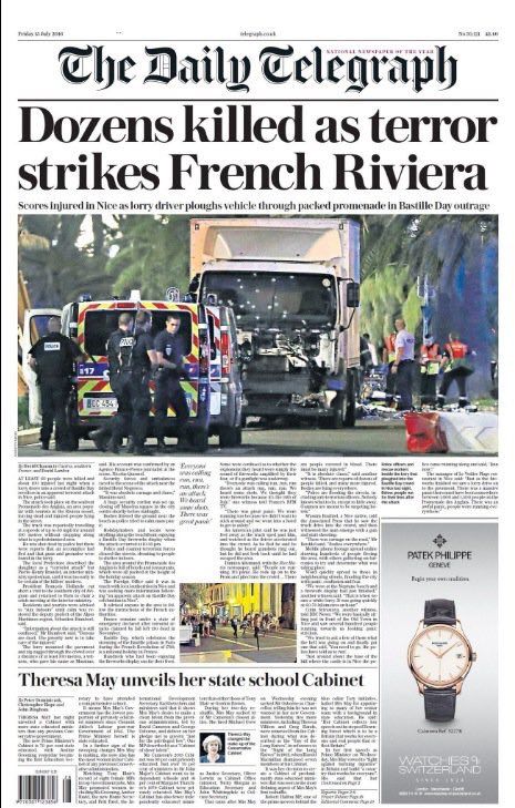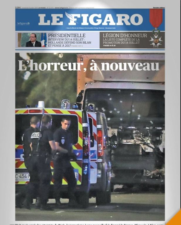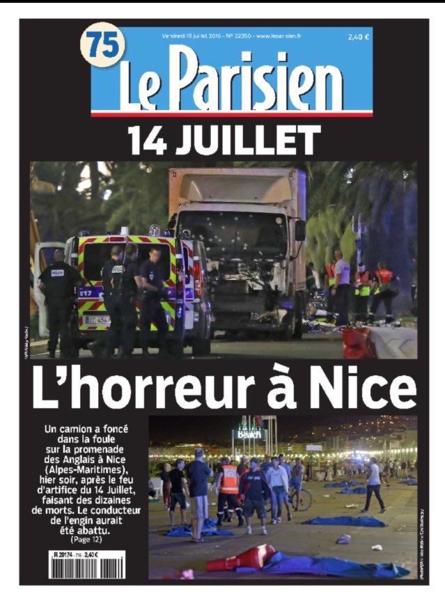 Luego de los atentados ocurridos este día al sur de Francia, donde un atacante a bordo de un camión embistió a una multitud que presenciaba un espectáculo de pirotecnia con motivo de la conmemoración de la toma de la Bastilla, la prensa internacional ha puesto en sus portadas dicha noticia, mostrando el dolor, la cantidad de muertos y fotografías ilustrativas.