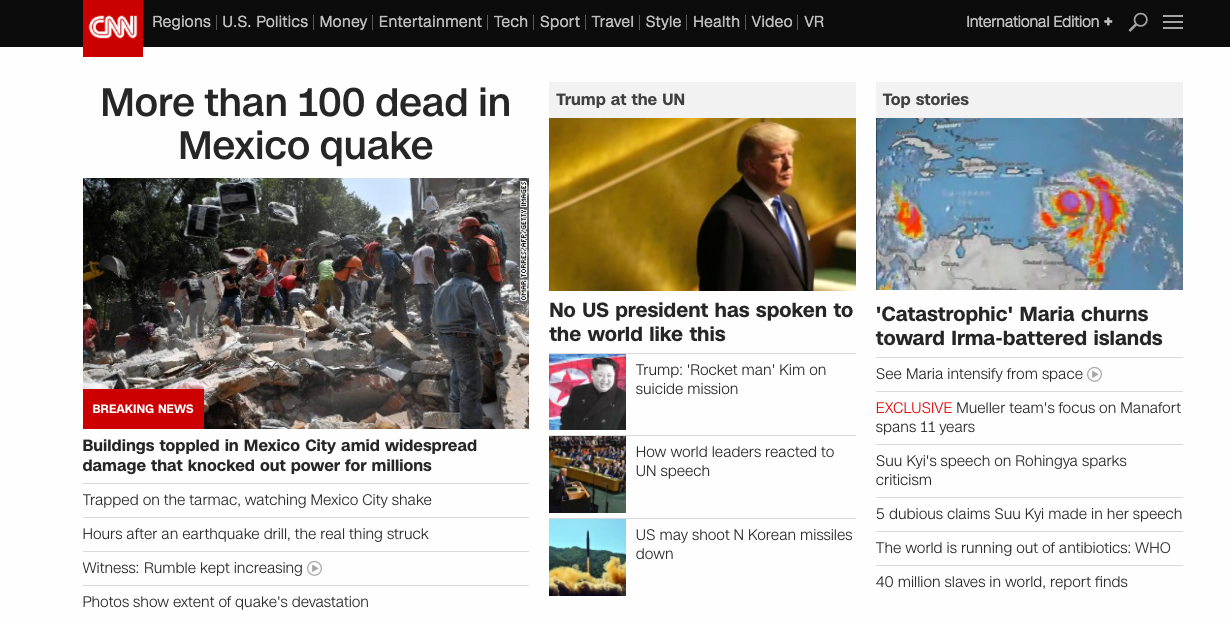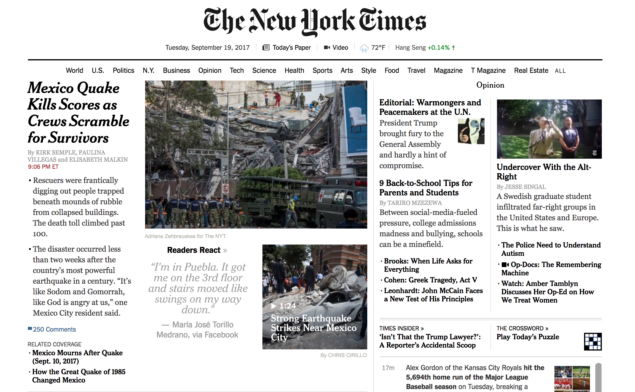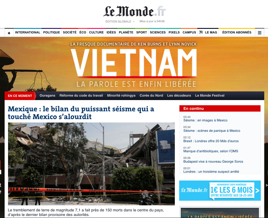 Internacional Reacciones en el mundo tras sismo en MéxicoLos medios internacionales reportaron el intenso sismo que se registró esta tarde en la Ciudad de México septiembre 19, 2017 Después del terremoto de 7.1 que se sintió en la zona centro de México, la prensa internacional comenzó a dar cobertura a este hecho.Aquí algunas de las reacciones en los portales de información más importantes del mundo.RedacciónMinuto a minuto El Mundo En Latinoamérica se conmemora el Viernes Santo con procesiones y plegarias El Mundo Casa Blanca en medio del hermetismo tras el derribo de un avión de EE.UU. por Irán El Mundo Trump ordena el pago a 35 mil empleados afectados por cierre del Departamento de Seguridad Estados Recogen 889.4 toneladas de hidrocarburo en 48 playas del Golfo de México tras emanaciones Ciencia y Tecnología La misión Artemis II casi a mitad de camino de hacer historia en el regreso a la Luna