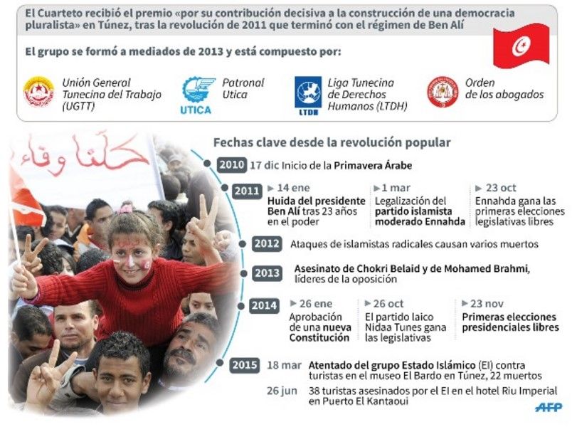 El Cuarteto para el Diálogo Nacional en Túnez, que ayudó a construir la democracia en el país tras la revolución de 2011, recibió el jueves el premio Nobel de la Paz.