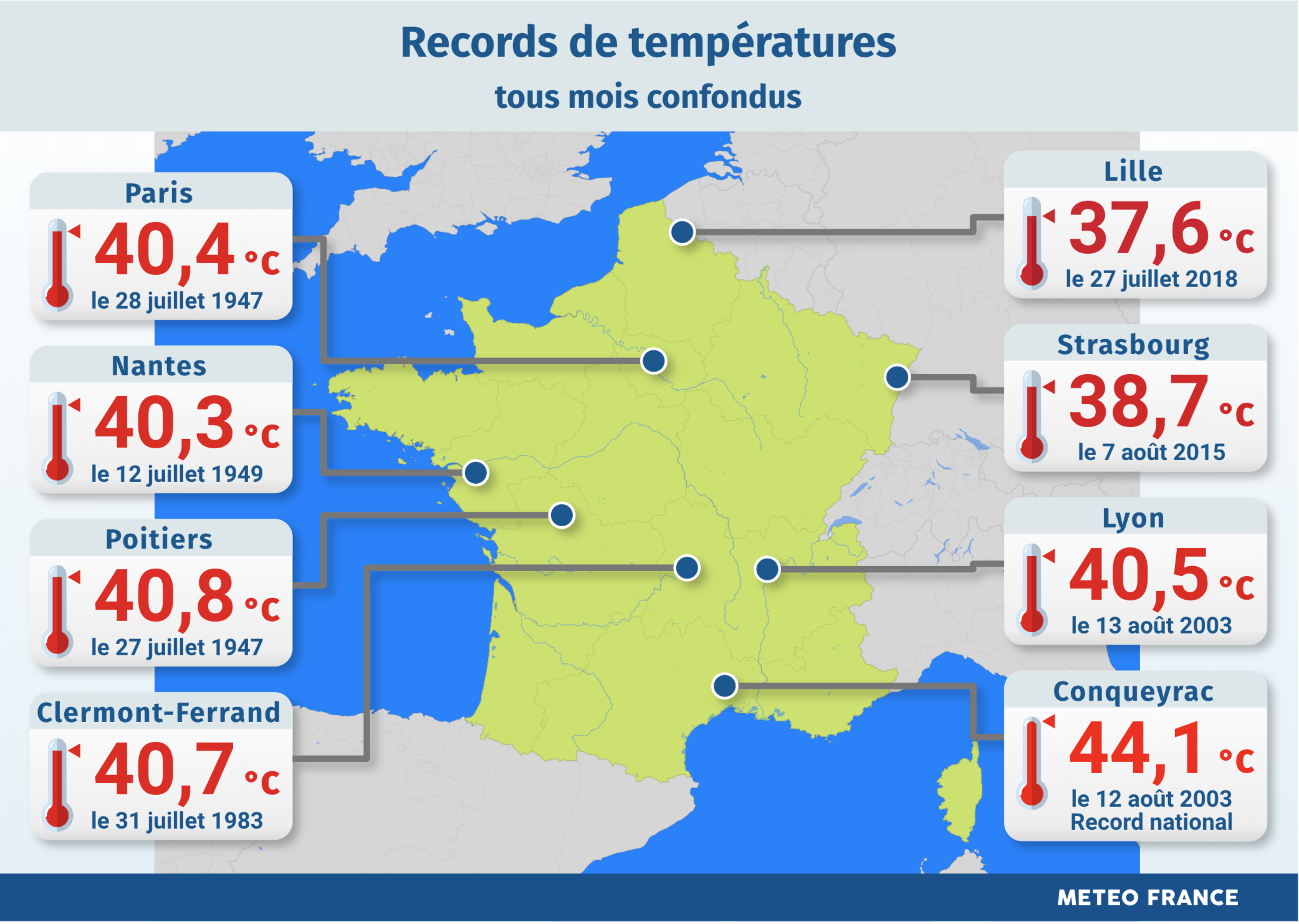 “Es algo histórico”, comentó el meteorólogo Etienne Kapikian, quien apuntó que este récord podía ser superado durante la jornada. El precedente databa del 12 de agosto de 2003, cuando se registraron 44,1 ºC en Saint-Christol-les-Alès y Conqueyrac, también en el sur.