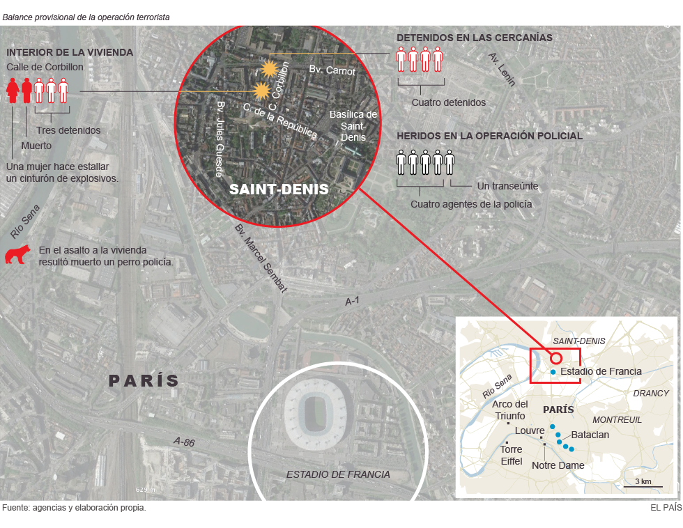 De acuerdo al ministro del Interior y el fiscal de París, otro yihadista murió durante el asalto y al menos siete personas fueron detenidas. Tres dentro de un inmueble registrado y cuatro en los alrededores.