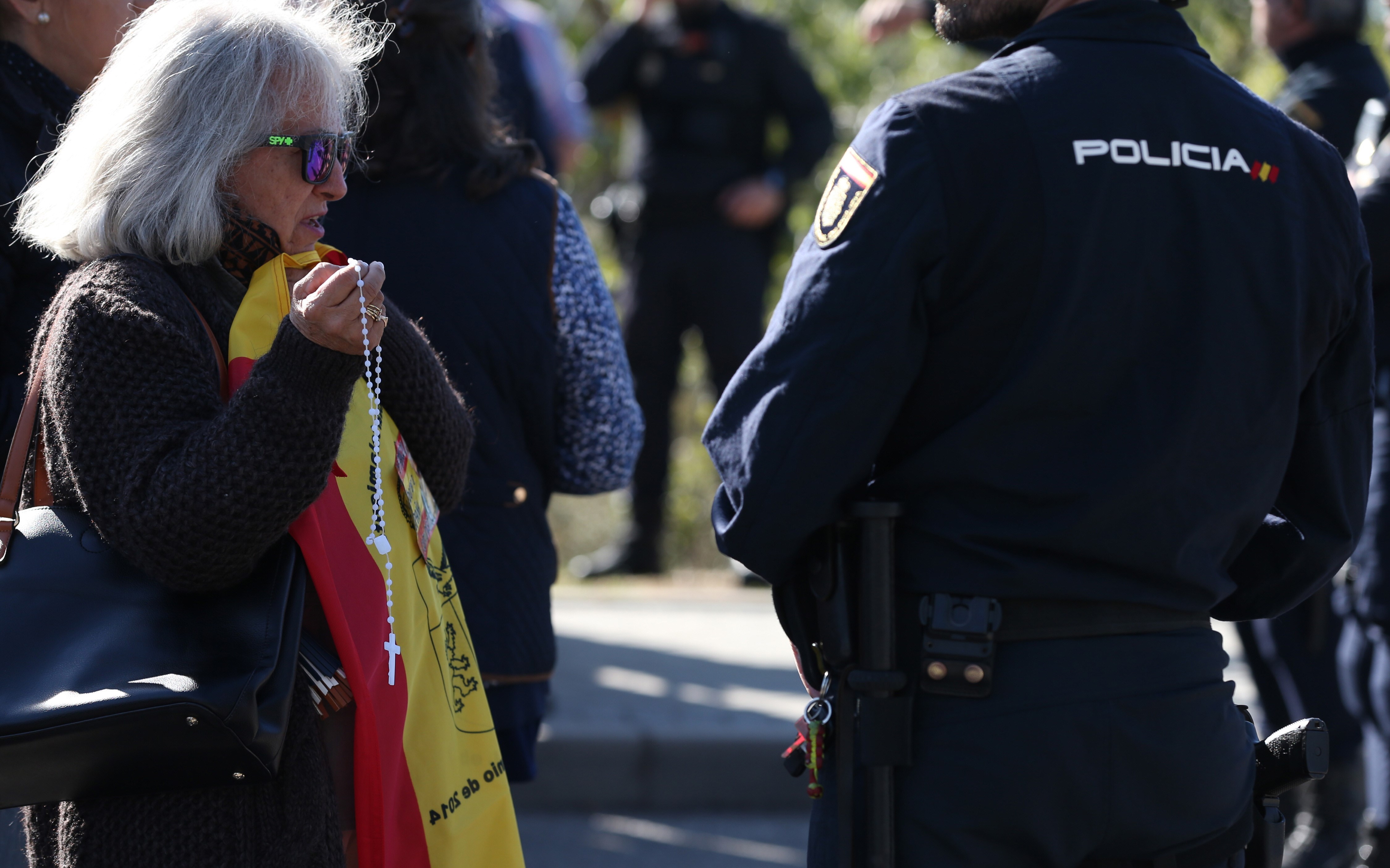 Una mujer reza durante la concentración de varias personas a la salida de los familiares del cementerio de Mingorrubio tras enterrar a Francisco Franco en un panteón junto a su esposa, Carmen Polo. EFE/Javier Lizón