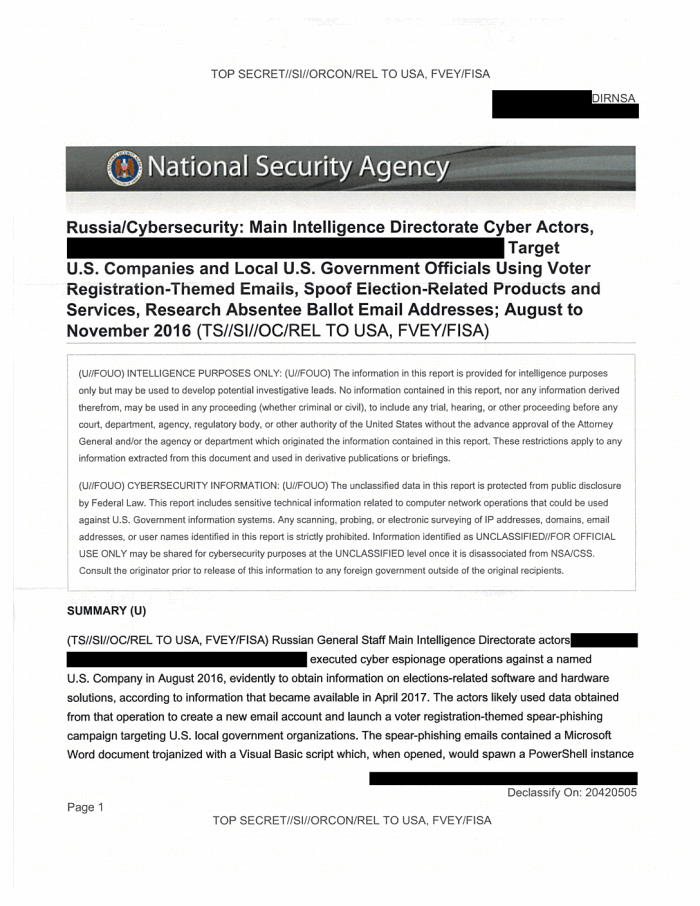 El informe clasificado de la Agencia de Seguridad Nacional (NSA por sus siglas en inglés) que la publicación digital The Intercept difundió en internet no indica si los hackeos tuvieron algún efecto en el resultado electoral. Pero dice que la inteligencia militar rusa atacó a una compañía de software electoral estadounidense y envió correos electrónicos a más de 100 funcionarios electorales locales a finales de octubre o principios de noviembre con el propósito de robar información.