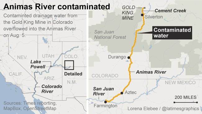 Las autoridades locales indican que el accidente ocurrió cuando la Agencia de Protección de Medio Ambiente limpiaba las viejas y abandonadas instalaciones de la mina y el arroyo Ánimas, afluente del Colorado, es el afectado por el derrame. Además, han remarcado que el suministro de agua potable no está en riesgo, pero sí puede ser peligroso para la flora y fauna de la zona.