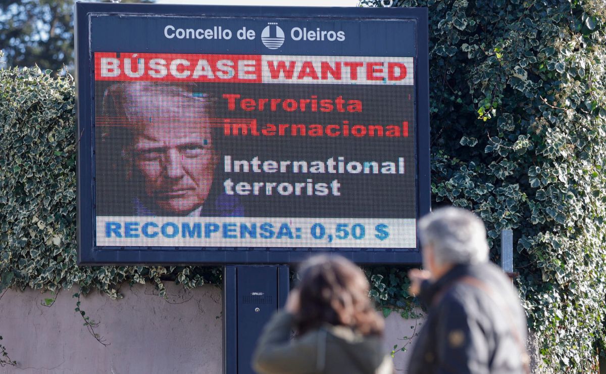 “BÚSCASE. WANTED”, se lee en un luminoso en la localidad de Oleiros, en la comunidad autónoma de Galicia, junto a la foto del presidente estadounidense y las palabras “Terrorista internacional”, en español e inglés.