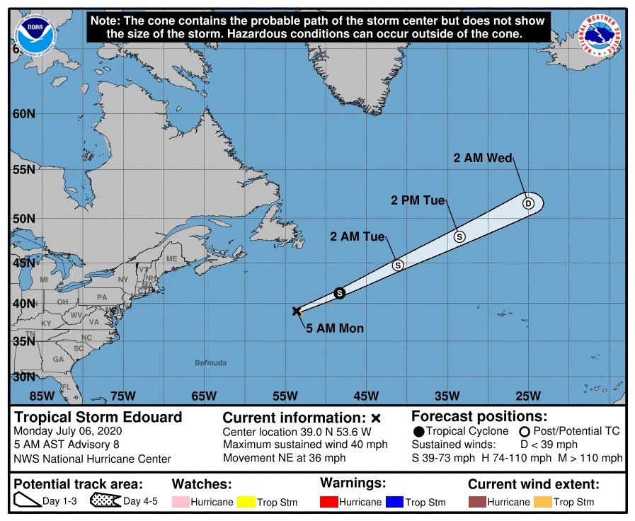 La tormenta tropical Edouard, que se formó el domingo por la noche en el norte del océano Atlántico, avanza hacia el noreste con unos vientos máximos de 65 kilómetros por hora, según informó el Centro Nacional de Huracanes (NHC).