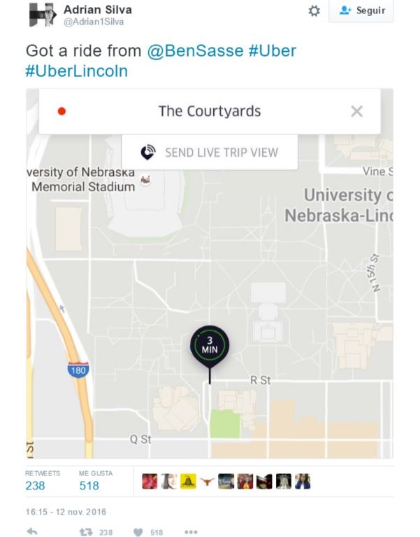 Un estudiante de la Universidad de Nebraska-Lincoln notó algo familiar sobre su chofer cuando pidió el servicio el pasado sábado. Una vez que el tuit se hizo famoso, el propio Sasse confirmó en la misma red social que, de hecho, él era quien conducía el Uber.