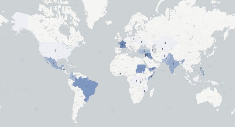 El primer lugar de América Latina lo ocupa Brasil con 7 periodistas asesinados. También se encuentran Colombia y Hondura con 4 cada uno, y finalmente Guatemala con tres casos registrados. México se ubica en el segundo lugar con seis homicidios.