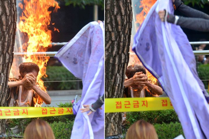 Kim Sun-min, una de varias personas que acudieron a sofocar las llamas, dijo que no había advertido la presencia del hombre, identificado por la policía como Choi Yeon-yeol, antes de que se prendiera fuego sobre un cantero de flores.