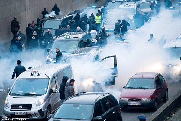Cientos de taxis franceses, a los que se sumaron algunos belgas y españoles, bloquearon una importante intersección de acceso al oeste de París, causando cortes de tráfico en las avenidas circundantes. Docenas de taxistas intentaron marchar desde el cruce de porte Maillot hacia un puente de ocho carriles, pero la policía los rechazó con gases lacrimógenos.