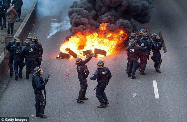 Los policías de París tuvieron que utilizar gases lacrimógenos cuando los taxistas encendieron hogueras en su protesta contra Uber