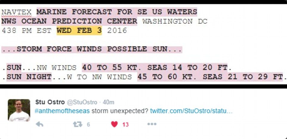El 4 de febrero se pronosticó la fuerte tormenta en el Atlántico, sin embargo el crucero decidió seguir su recorrido como estaba planeado.