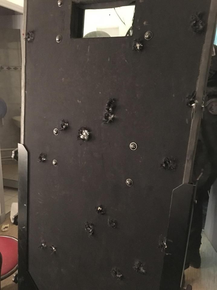 “Avanzábamos bajo el fuego de los terroristas sin disparar porque había rehenes, estábamos detrás del escudo”, recordó un elemento mientras mira la foto del escudo con veinte impactos de bala tomada por un fotógrafo.