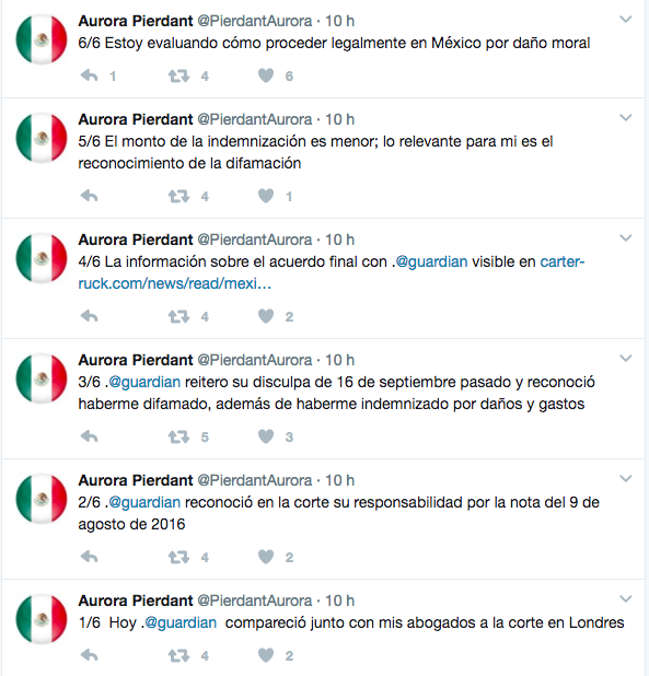 La abogada mexicana dio a conocer que sus abogados comparecieron este martes junto con The Guardian en la Corte de Londres, donde el diario reconoció su responsabilidad por la nota del 9 de agosto de 2016.