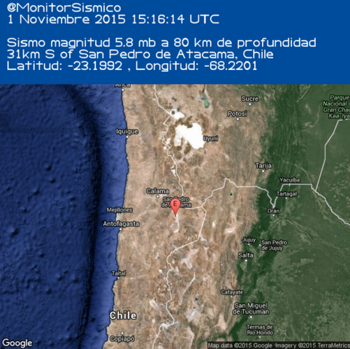 Según el Centro Sismológico Nacional la magnitud del sismo fue 5,9 Richter, 48 Kms al Suroeste de San Pedro de Atacama