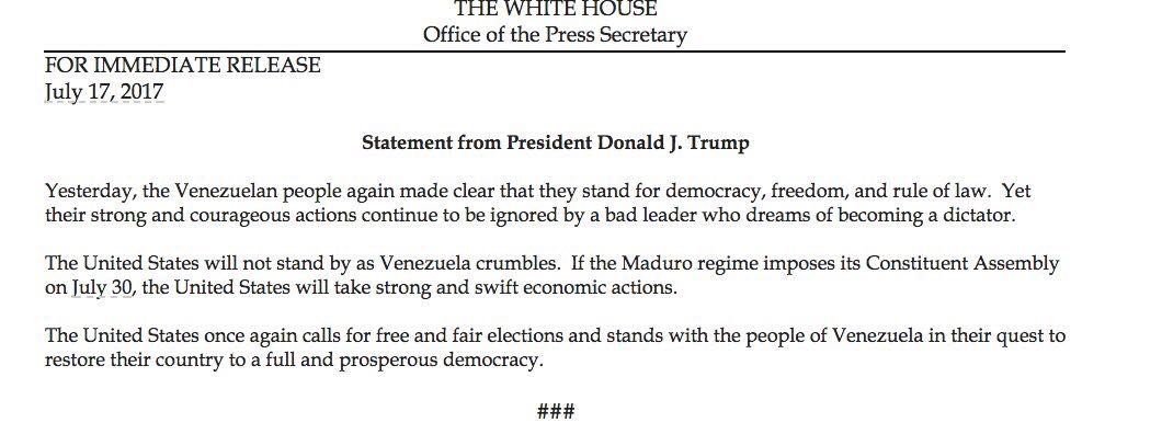 “Estados Unidos no se quedará inmóvil mientras Venezuela se desmorona. Si el régimen de Maduro impone su Asamblea Constituyente el 30 de julio, los Estados Unidos tomarán fuertes y rápidas acciones económicas”, añadió el comunicado.