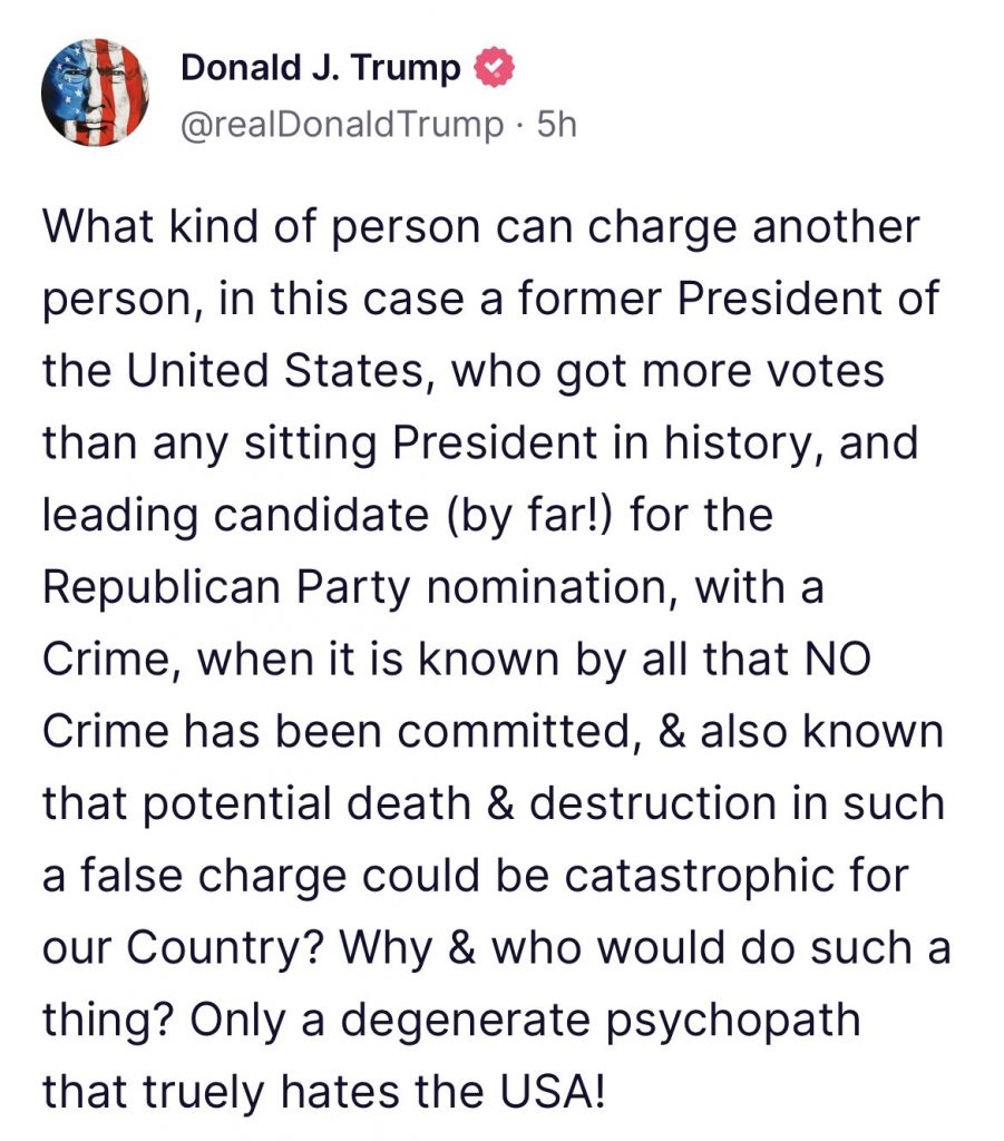 Trump advierte "potencial muerte y destrucción" si es imputado - mensaje-de-trump-en-truth-social-901x1024