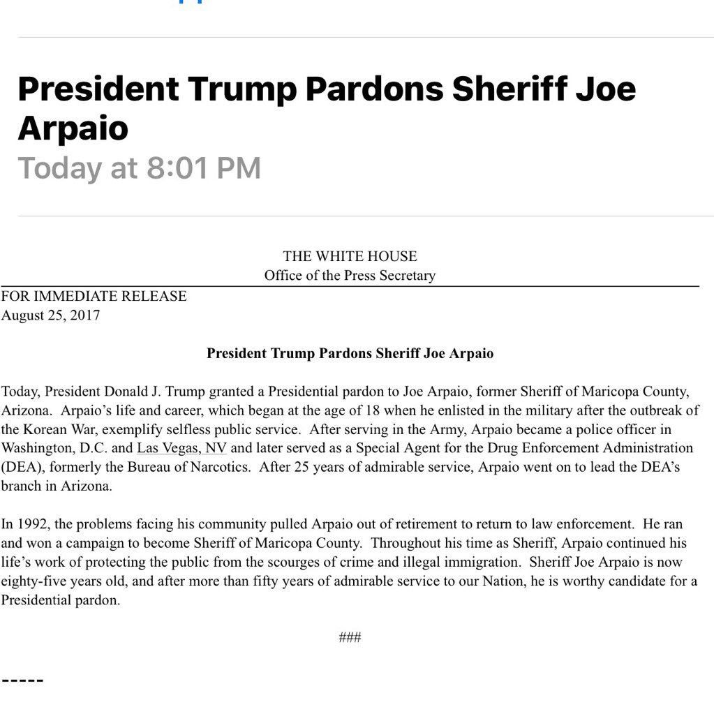 En el comunicado del viernes, la Casa Blanca señaló que “durante todo el tiempo que fue jefe de policía, Arpaio continuó el trabajo de su vida de proteger al público de los azotes de la delincuencia y la inmigración ilegal. El sheriff Joe Arpaio tiene ahora 85 años de edad y, después de más de 50 años de servicio admirable a nuestra nación, es un candidato merecedor a un indulto presidencial”.