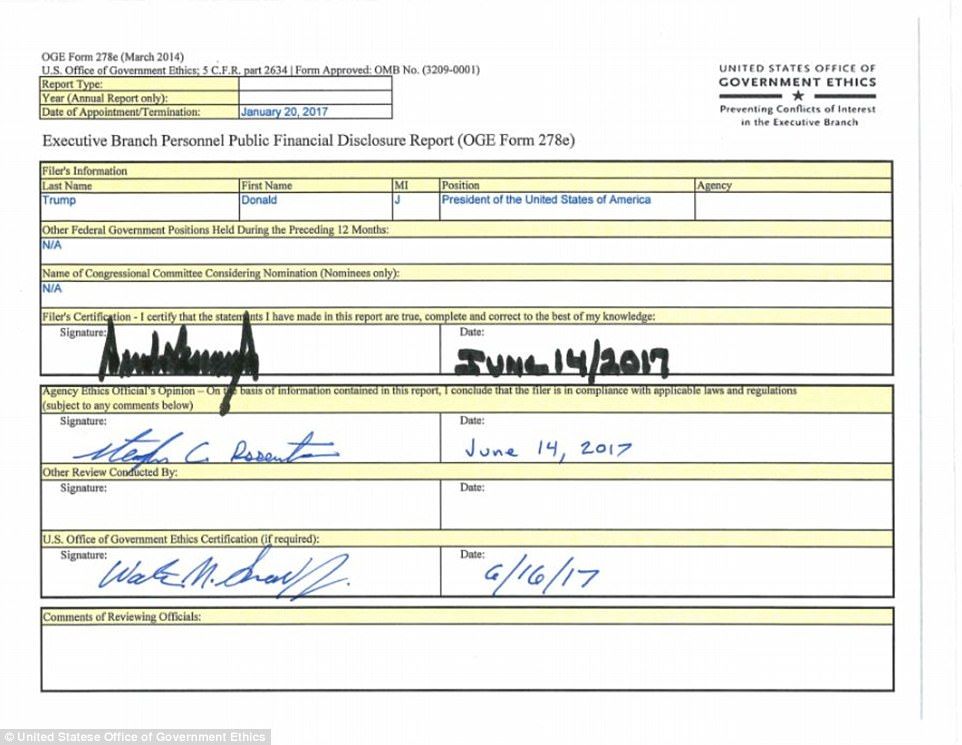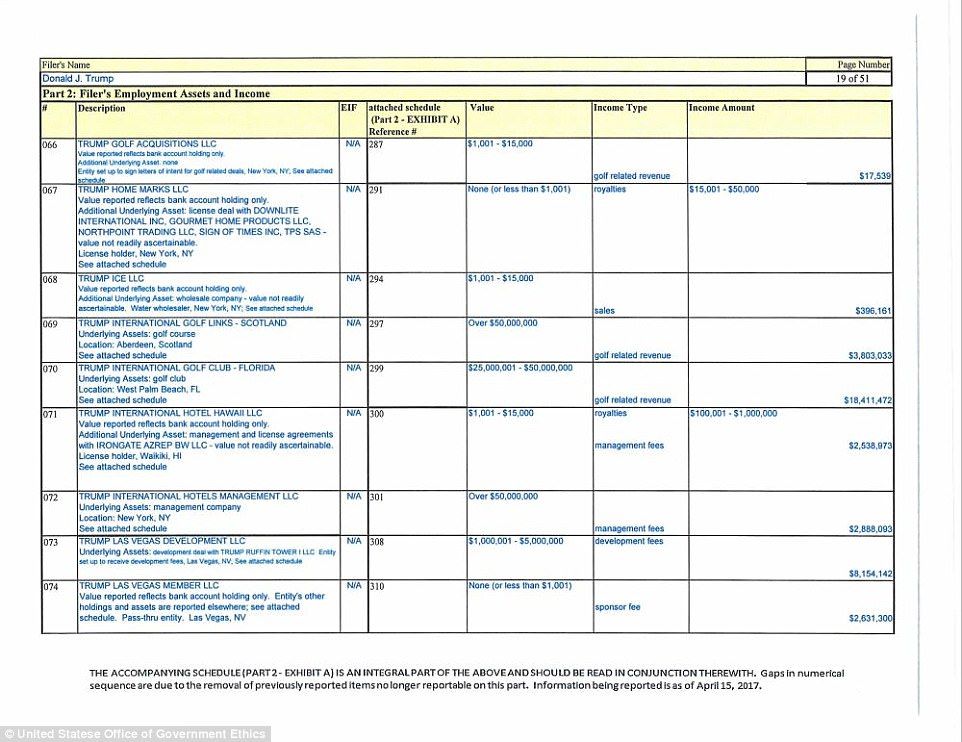 La información aparece en un nuevo reporte financiero que hizo voluntariamente para la Oficina de Ética Gubernamental. El documento cubre de enero de 2016 al primer trimestre de 2017.