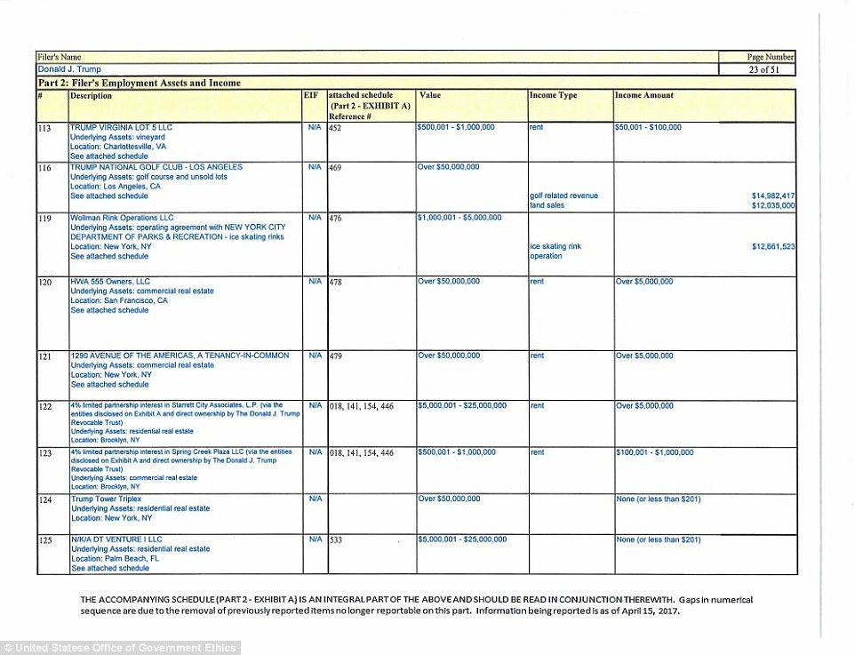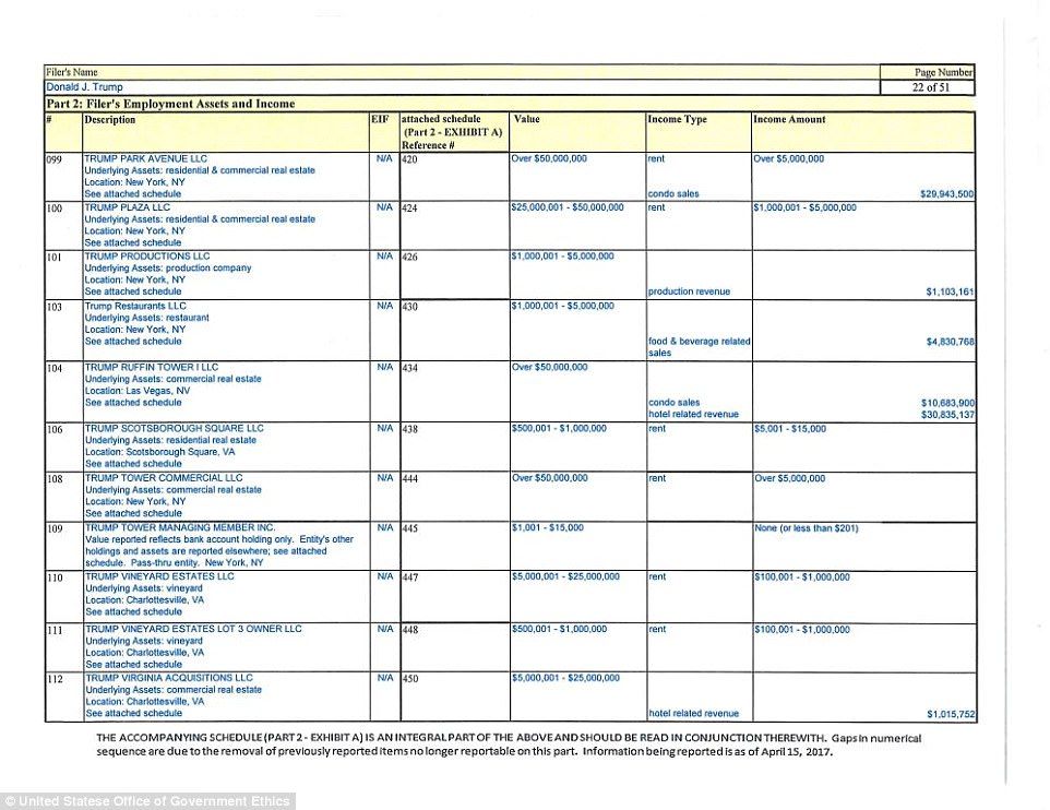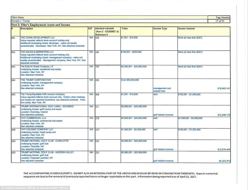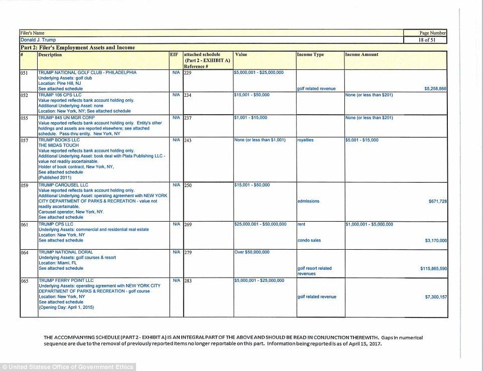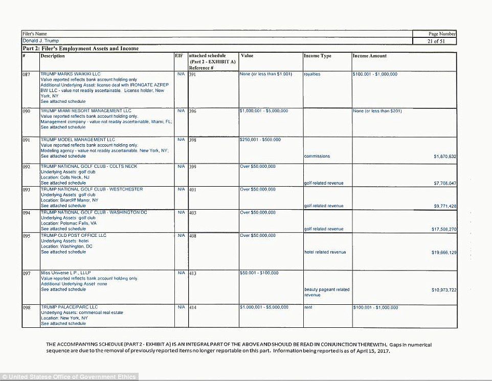El reporte muestra que Trump renunció a más de 500 puestos, muchos de ellos un día antes de prestar juramento al cargo presidencial. Trump enlistó al menos 315 millones de dólares en obligaciones financieras, casi la misma cantidad que en un reporte presentado el año pasado.