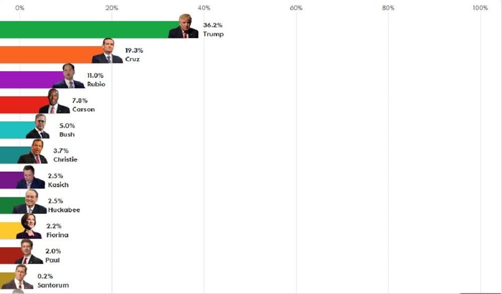 No obstante, el único que mostró gran constancia a la alza, semana tras semana, fue Trump, al punto que la encuesta le da el 36.2 por ciento de la preferencia, muy por delante de Ted Cruz, en el segundo puesto, quien tiene 19.3 por ciento.