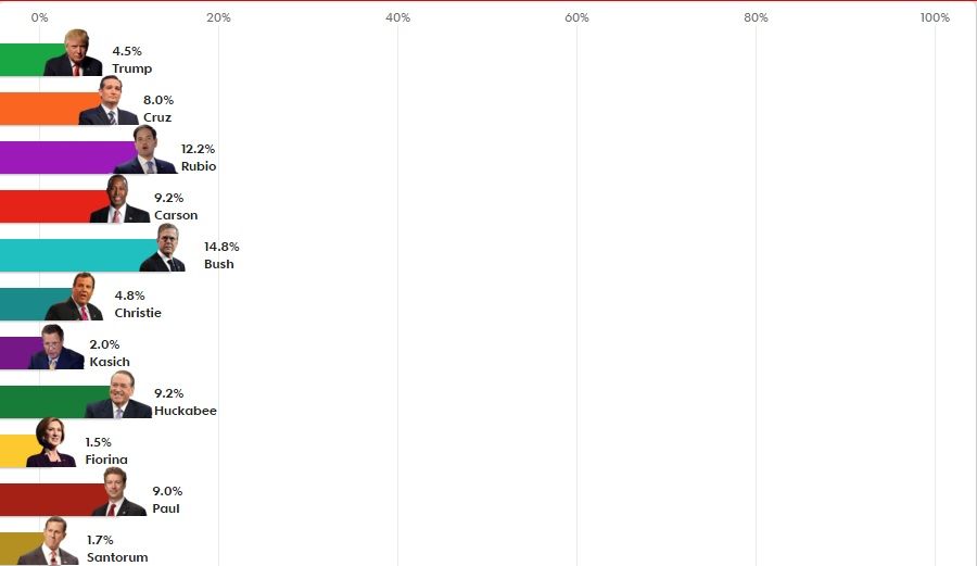 Esto es una cifra completamente inesperada y contrastante con lo mostrado a finales de septiembre, cuando el consenso general de los expertos señalaba que Trump había alcanzado -en esa fecha- su pico, y que sus disputas con varios candidatos y figuras públicas lo irían agotando. La encuesta quizá puede confirmar que Carly Fiorina y Marco Rubio también se mantuvieron a la alza por sus actuaciones en los debates.