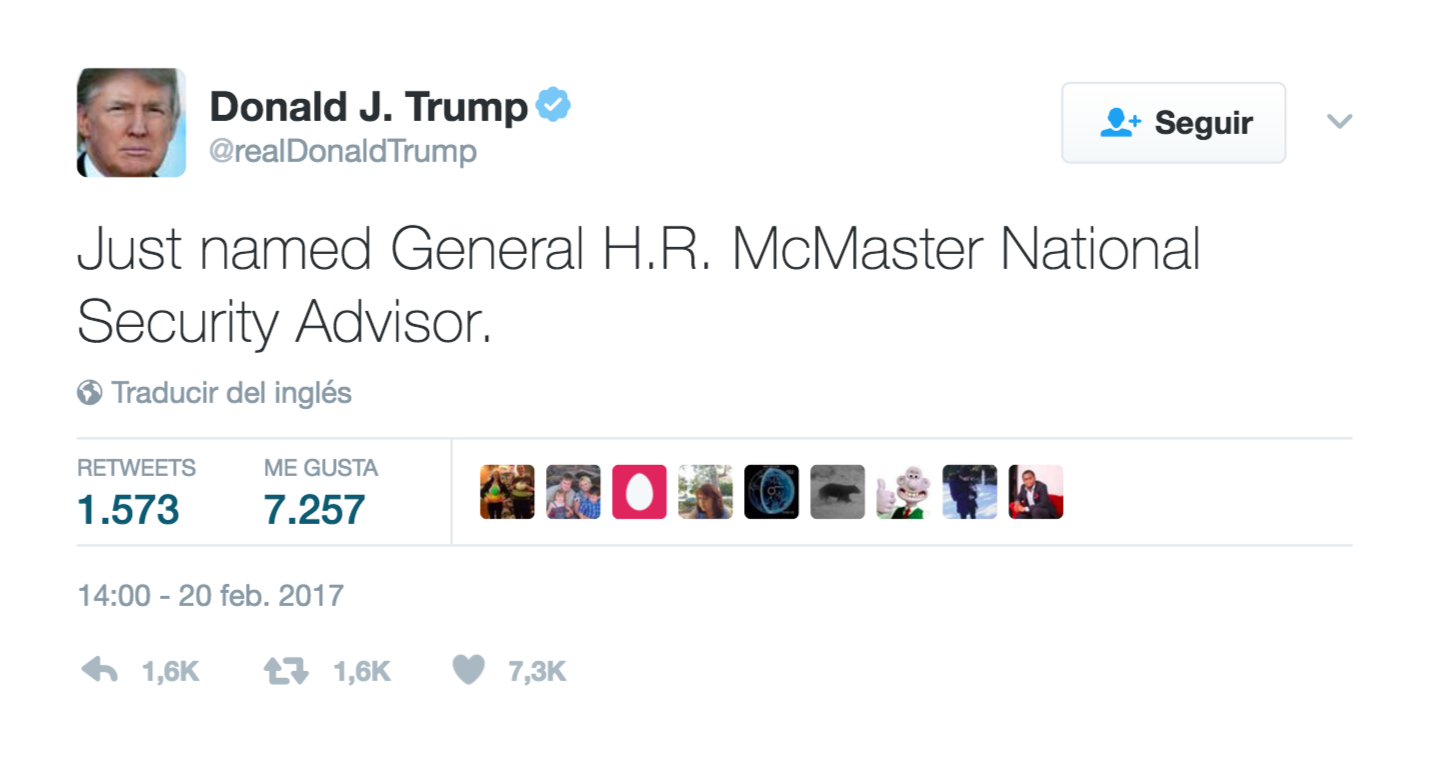 Trump designó a H.R. McMaster como el sustituto de Michael Flynn. Además confirmó al general Keith Kellog al Consejo de Seguridad Nacional