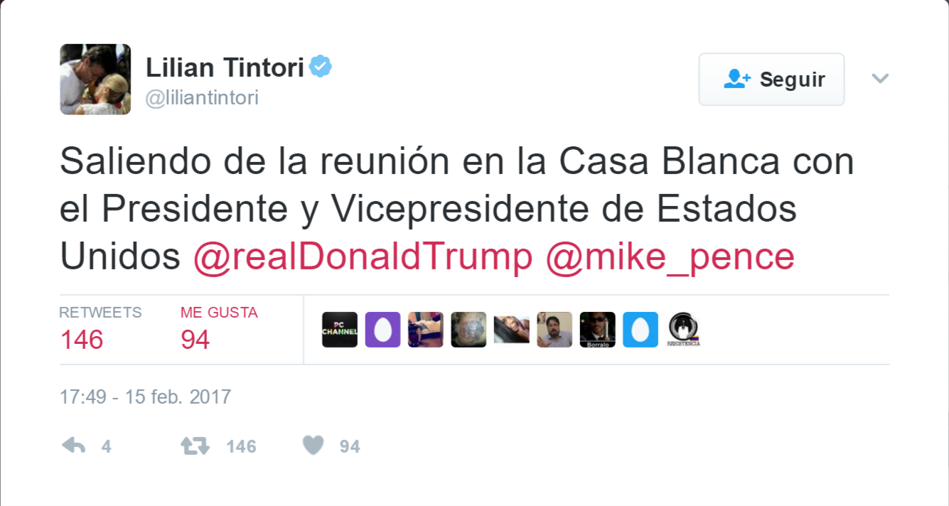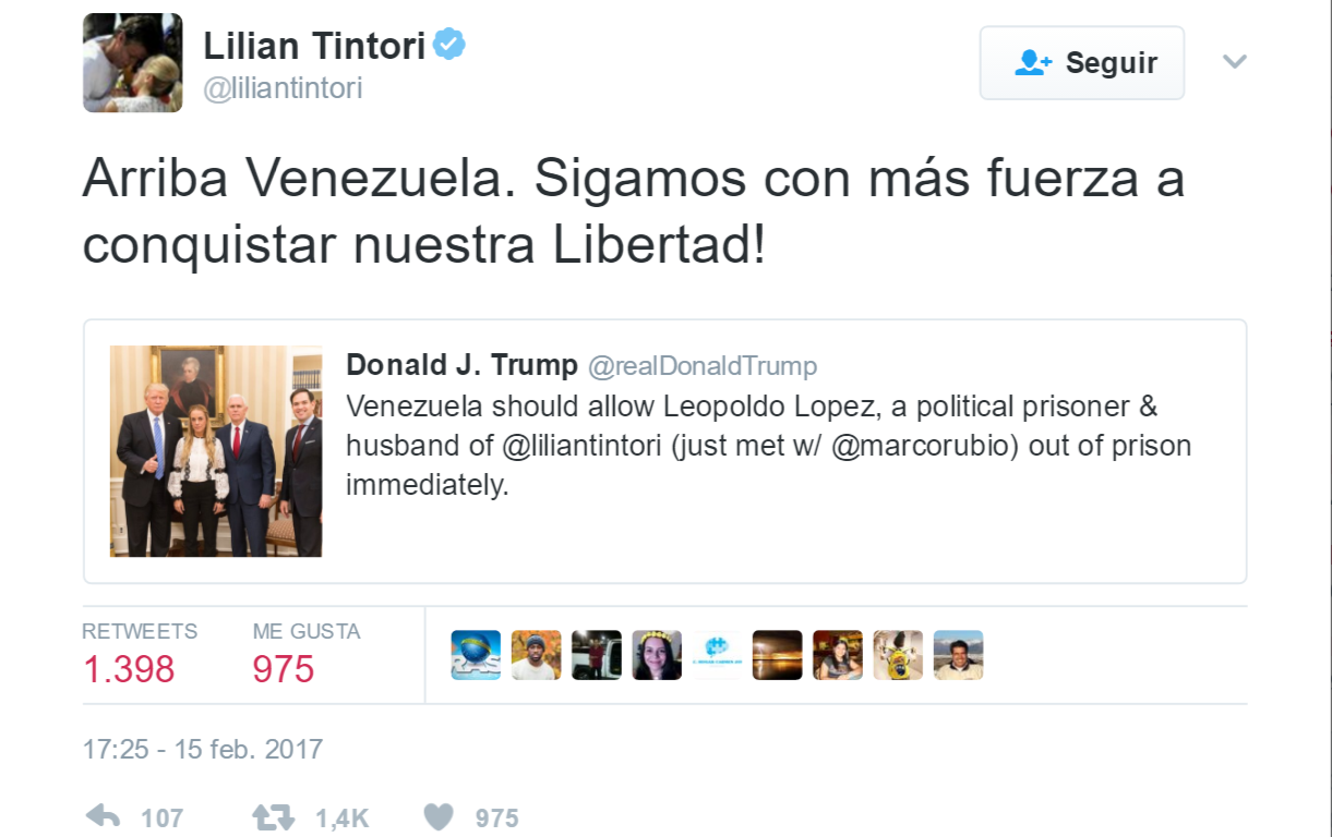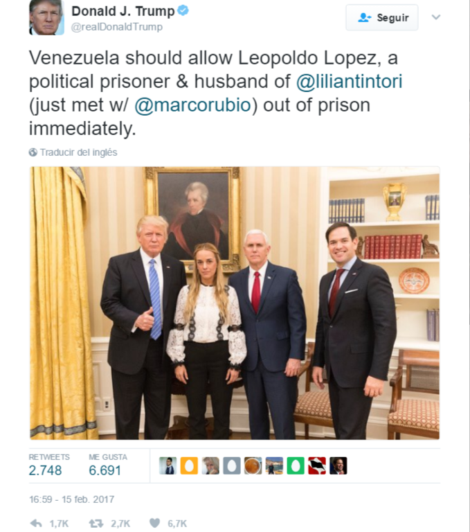 En su cuenta personal @RealDonaldTrump, emitió un tuit señalando “Venezuela debe permitir que Leopoldo López, preso político y esposo de @liliantitori (que acabo de conocer con @marcorubio) salga de prisión inmediatamente”.