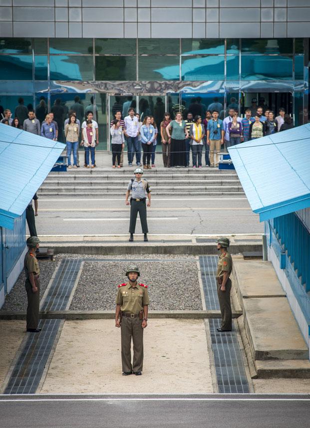 En Panmunjom, en el Área de Seguridad Compartida como se ve desde el lado de Corea del Norte en la Línea de Demarcación Militar, justo en el centro de la Zona Desmilitarizada de Corea. No se puede cruzar.